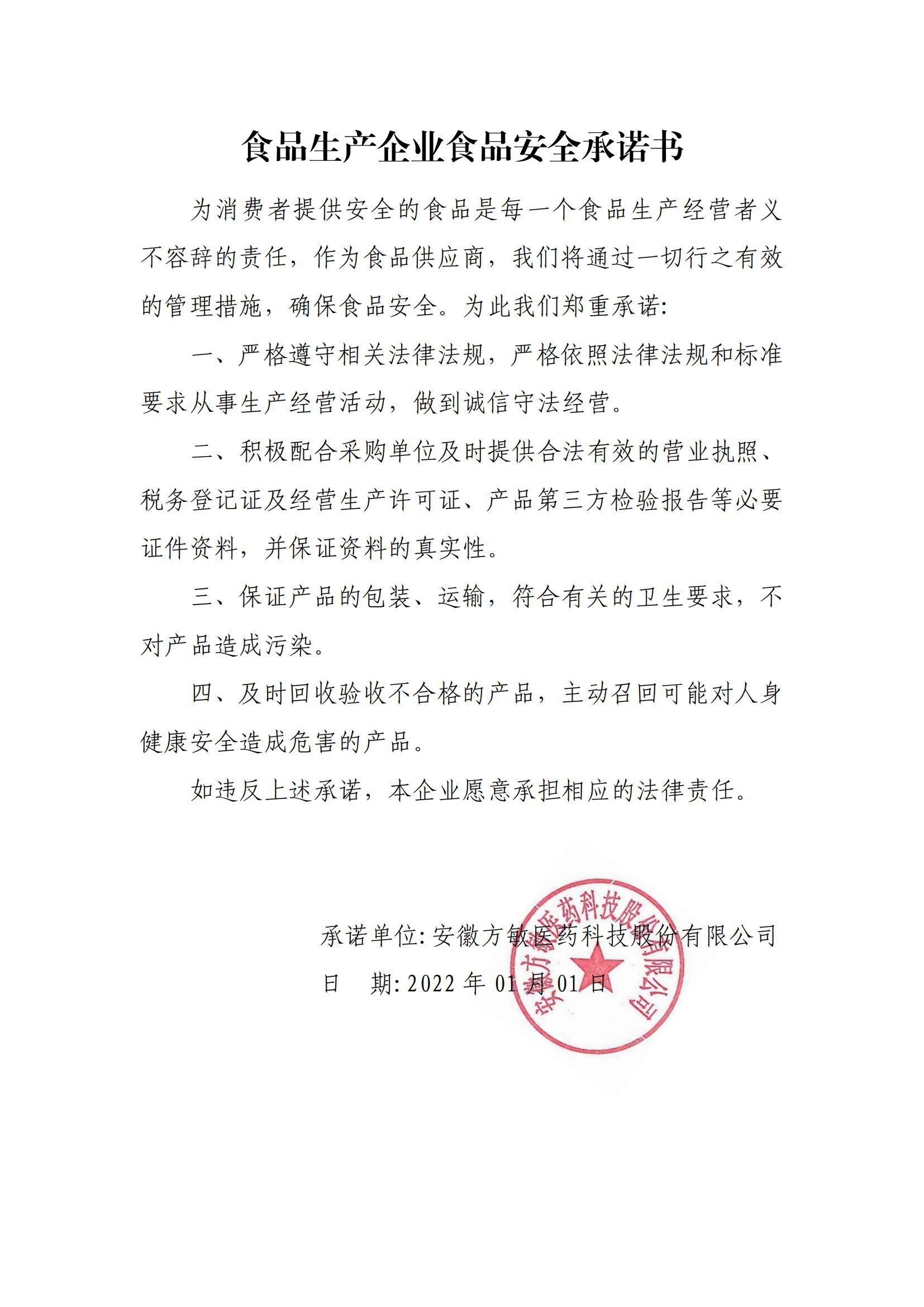 食品生產企業(yè)食品安全承諾書
