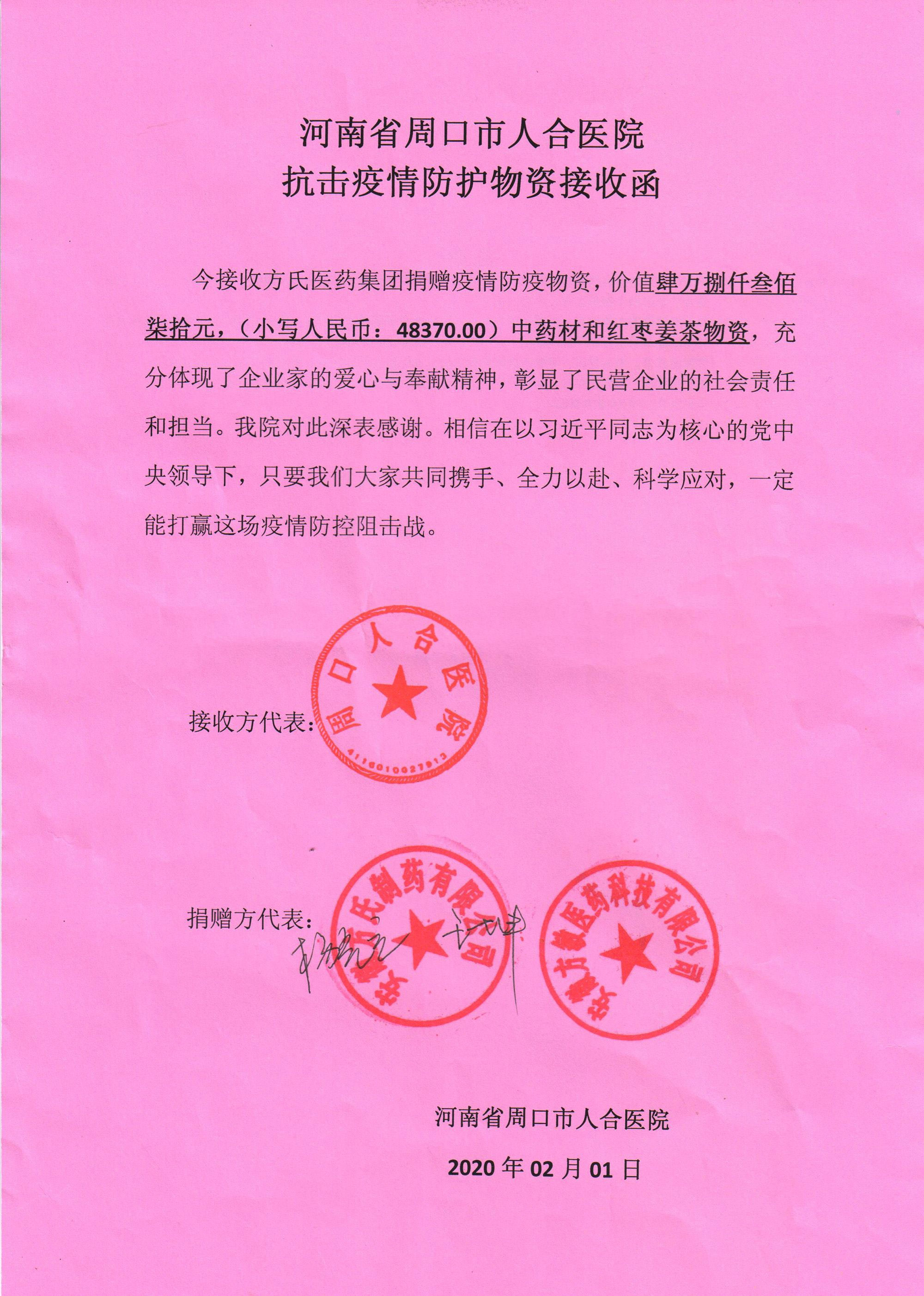2月1日下午,安徽方氏醫藥集團為河南省周口市人合醫院捐贈了一批急需防疫物資(價值4.83萬元的中藥材和方敏牌紅棗姜茶)。