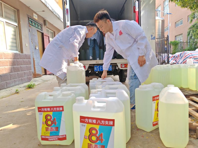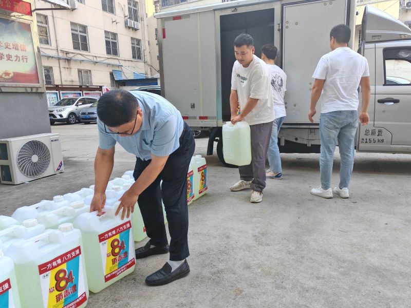 孫大福副主席同員工一起將捐贈的84消毒液卸車